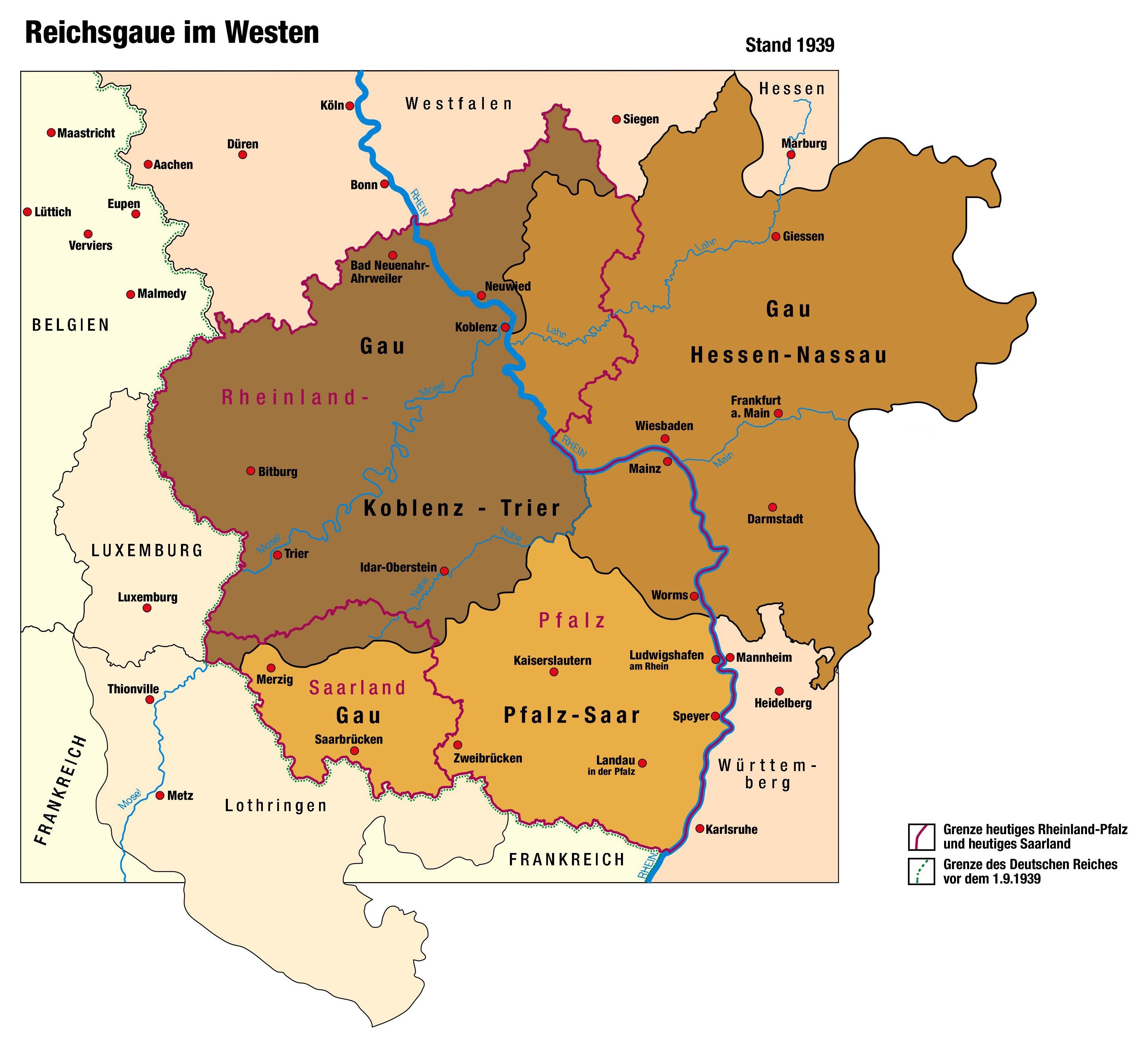 Der Gau Koblenz-Trier entstand 1931 durch Teilung des Gaues Rheinland-Süd in die Gaue Köln-Aachen und Koblenz-Trier. Gustav Simon wurde Gauleiter von Koblenz-Trier. 1925 war er der NSDAP beigetreten und gründete die Ortsgruppe Hermeskeil. Vom 1. Juni 1931 bis 1945 war er Gauleiter Koblenz-Trier (Moselland), ab 1940 Chef der Zivilverwaltung in Luxemburg. Januar 1941 erhielt der Gau die Bezeichnung Moselland und wurde mit dem de facto annektierten Großherzogtum Luxemburg verschmolzen. Staatsrechtlich wurde die Annexion Luxemburgs, des Elsass und Lothringens noch nicht vollzogen. In der Herrschaftspraxis wurden die Gebiete allerdings als "heim ins Reich" zurückgekehrte Regionen betrachtet.