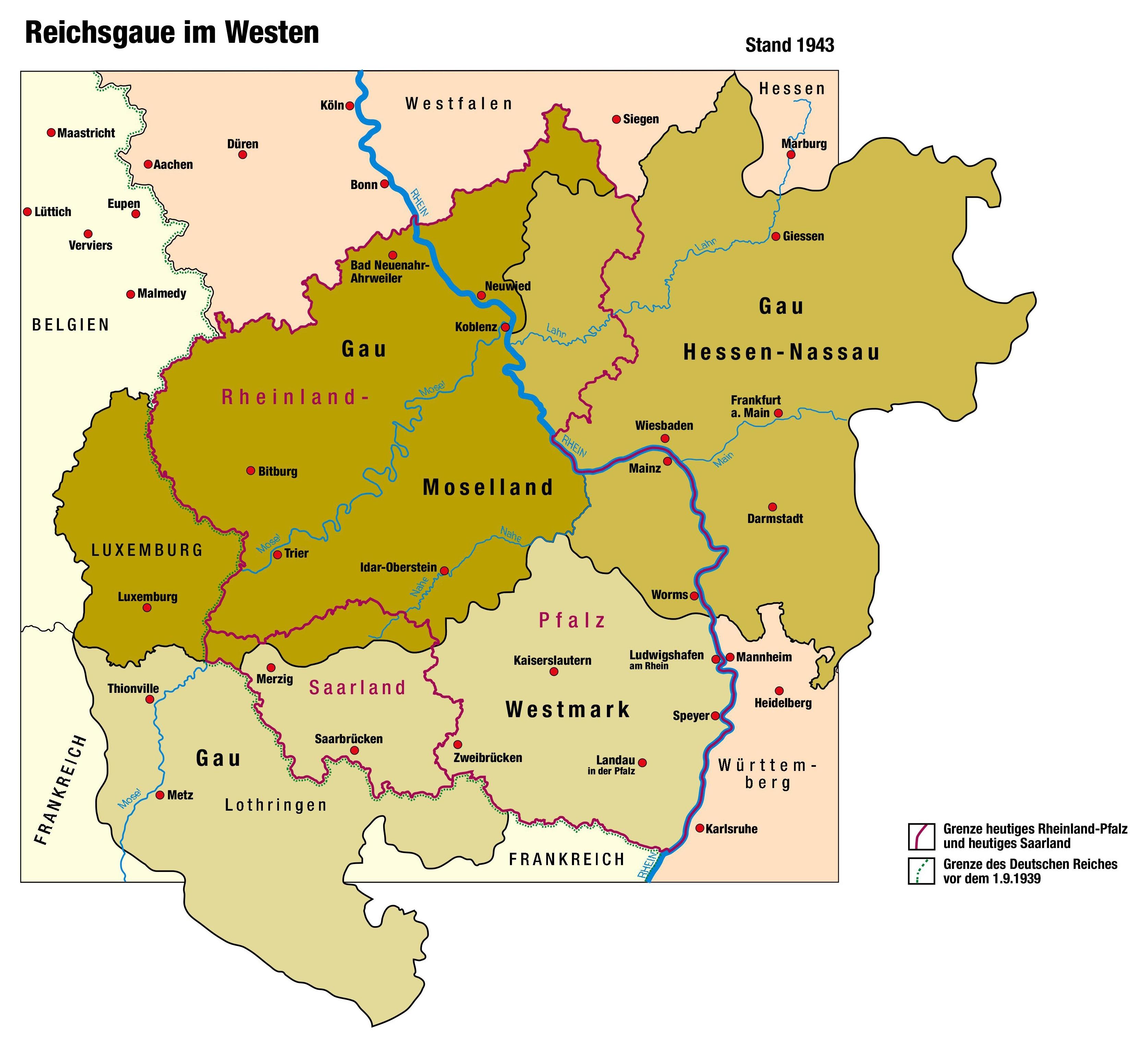 Der Gau Saarpfalz war 1935 durch den nach der Volksabstimmung erfolgten Anschluss des Gaues Saarland an den Gau Rheinpfalz entstanden und führte bis 1937 zunächst die Bezeichnung Gau Pfalz-Saar. 1940 wurde er um lothringische Gebiete erweitert und hieß Gau Westmark. Gauleiter war bis zu seinem Tod 1944 Josef Bürckel. 1925 war er der NSDAP beigetreten, 1926 wurde er zum Gauleiter des Gaues Rhein-Pfalz gewählt. 1938 wurde er Reichskommissar für die Wiedervereinigung Österreichs mit dem Reich, ab 1939 war er außerdem Reichsstatthalter in Österreich, ab 1940 Chef der Zivilverwaltung in Lothringen sowie ab 1941 Reichsstatthalter in der Westmark. Ihm folgte 1944 Willi Stöhr.