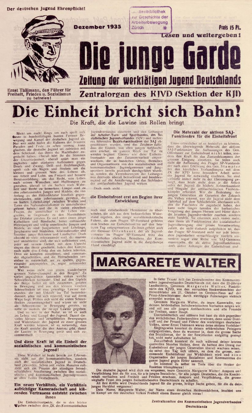 Viele Mitglieder des Kommunistischen Jugendverbandes Deutschlands (KJVD) engagierten sich nach der Machtübernahme Hitlers im Widerstand. Ihre Hoffnung, das Regime in relativ kurzer Zeit stürzen zu können, erwies sich jedoch als illusionär. KJVD-Unterbezirksorganisationen gab es beispielsweise in Mainz, Kaiserslautern, Worms und Ludwigshafen. Unerfahren in konspirativer Arbeit, fielen zahlreiche Jungkommunisten schon bald dem NS-Fahndungsapparat oder Denunzianten zum Opfer. Andere wurden verhaftet, nachdem sie in den konspirativen Kreis der KPD nachgerückt waren, um diesen nach den schweren Verhaftungsschlägen der ersten Jahre der Diktatur personell zu verstärken. Die KPD musste nach den Massenverhaftungen Mitte der 1930er Jahre im Prinzip gänzlich darauf verzichten, eigene KJVD-Widerstandsgruppen zu bilden. Das schließt aber nicht aus, dass auch später gelegentlich allein aus jungen Kommunisten gebildete Strukturen aktiv wurden. Der von den Arbeiterorganisationen konsequent gegen das "Dritte Reich" geleistete Widerstand stützte sich in jeder seiner Phasen maßgeblich auf die Risikobereitschaft gerade jüngerer Mitglieder und Sympathisanten.